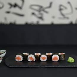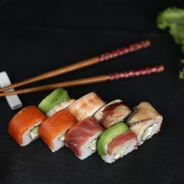 8 ნაჭერი, (270გრ) ორაგული, უნაგი, კრემყველი, კიტრი, სეზამი შერეული, ბრინჯი, ნორი, ჯინჯერი, ვასაბი, სოიოს სოუსი