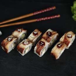 8 ნაჭერი, (365გრ) უნაგი, კრევეტი, ტობიკო წითელი, კრემყველი, ავოკადო, სეზამი, უნაგის სოუსი, ბრინჯი, ნორი, ჯინჯერი, ვასაბი, სოიოს სოუსი