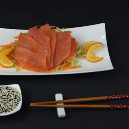 8 ნაჭერი, (255გრ) შემწვარი ორაგული, კრემყველი, კიტრი, სეზამი, ნორი, ჯინჯერი, ვასაბი, სოიოს სოუსი