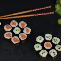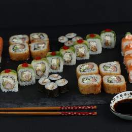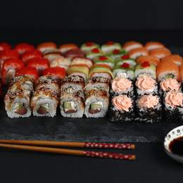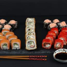 40 ნაჭერი,(1.500კგ) კალიფორნია ორაგულით, საკე უნაგი, იასაი როლი, საკე მაკი, კაპა მაკი, ჰიაში სალათი, ჯინჯერი, ვასაბი, სოიოს სოუსი