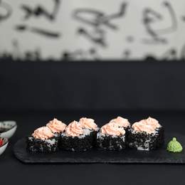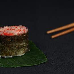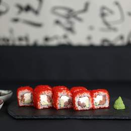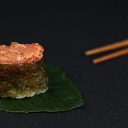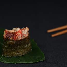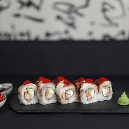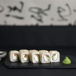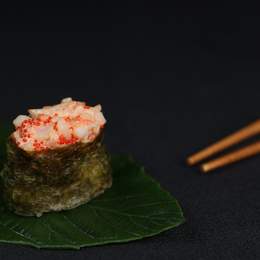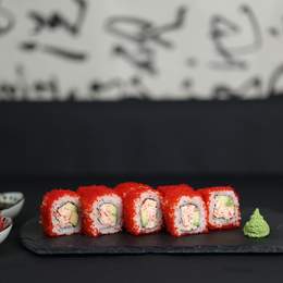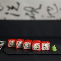 8 ნაჭერი, (340გრ) შეზავებული კრაბი, წითელი ტობიკო, კრემყველი, ავოკადო, ბრინჯი, ნორი, ჯინჯერი, ვასაბი, სოიოს სოუსი