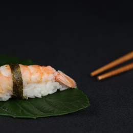 (90გრ) კრევეტი, სფაის სოუსი, ნორი, ბრინჯი, ჯინჯერი, ვასაბი, სოიოს სოუსი