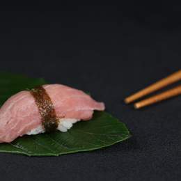 (90გრ) თინუსის ფილე, სფაის სოუსი, ნორი, ბრინჯი , ჯინჯერი, ვასაბი, სოიოს სოუსი