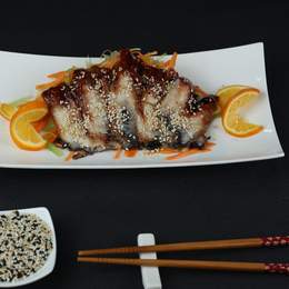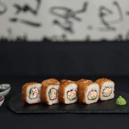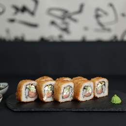 8 ნაჭერი, (275გრ) შემწვარი ორაგული, სფაის სოუსი, უნაგის სოუსი, კიტრი, სეზამის მიქსი, ბრინჯი, ნორი, ჯინჯერი, ვასაბი, სოიოს სოუსი