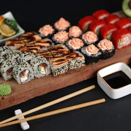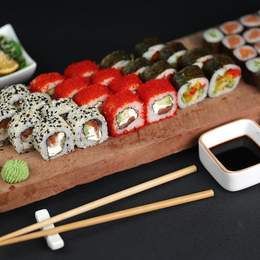 48 ნაჭერი, (2.255კგ) New York როლი, Canada ორაგულით, ფილადელფია კლასიკი, ცისარტყელა როლი, კალიფორნია კრაბით, ლავა როლი ორაგულით, ჯინჯერი, ვასაბი, სოიოს სოუსი