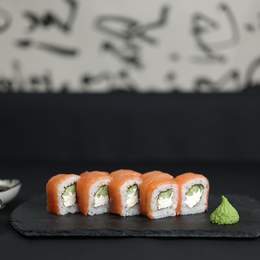 8 ნაჭერი, (350გრ) ორაგული, კრემყველი, კიტრი, ბრინჯი, ნორი, ჯინჯერი, ვასაბი, სოიოს სოუსი