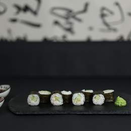8 ნაჭერი, (115გრ) კიტრი, ბრინჯი ნორი, ჯინჯერი, ვასაბი, სოიოს სოუსი