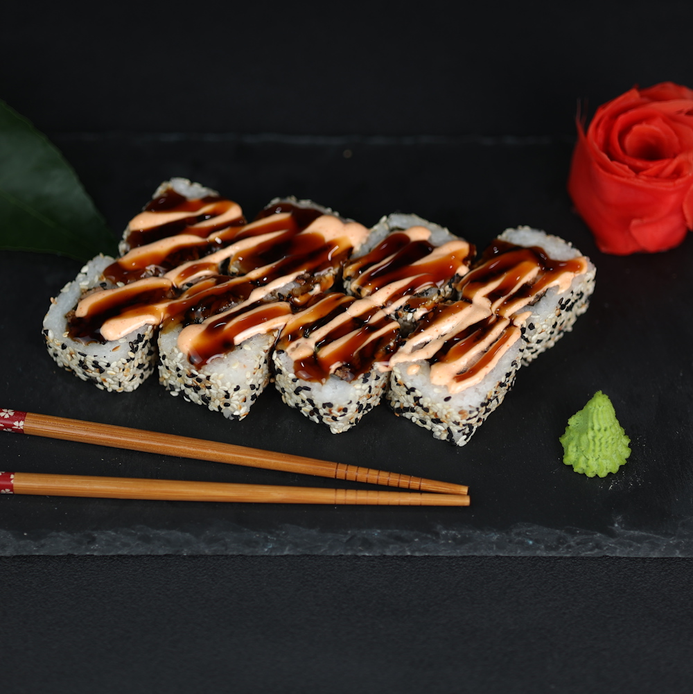 (90გრ) გველთევზა, სფაის სოუსი, ნორი, ბრინჯი, ჯინჯერი, ვასაბი, სოიოს სოუსი