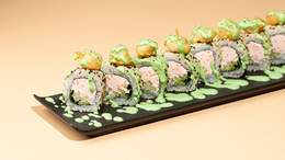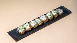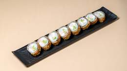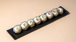 8 ნაჭერი; კრევეტი, სეზამი, მწვანე ხახვი, კრემყველი, ტობიკო, კიტრი, საფირმო სოუსი, ბრინჯი, ნორი, ჯინჯერი, ვასაბი, სოიო
