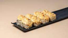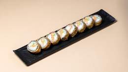 8 ნაჭერი, (265გრ) შემწვარი ორაგული, კრემყველი, კიტრი, სეზამი, ნორი, ჯინჯერი, ვასაბი, სოიოს სოუსი