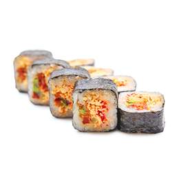 ბრინჯი, ნორი, კრევეტები, სპაისი სოუსი, ტობიკო, კიტრი, ავოკადო