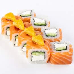 ახალი ორაგული, ბრინჯი, ნორი, კიტრი, კრემ ყველი , სოუსი უნაგი, ფორთოხალი