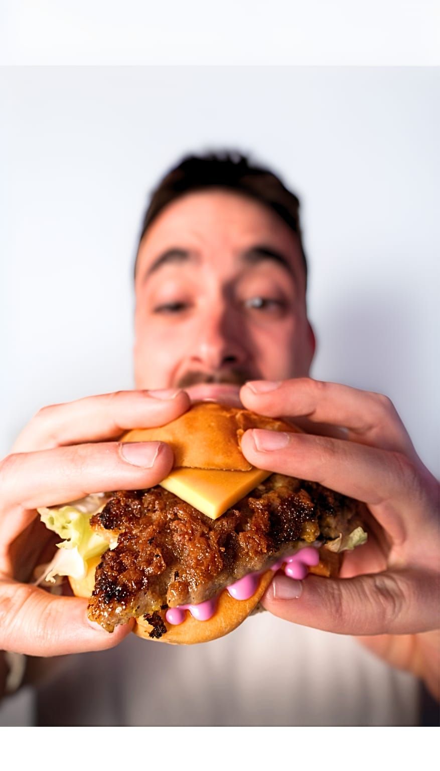 Smash burger de 130 g con pan de brioche negro, lechuga, coca de patata, cebolla caramelizada con hierbas dulces, salsa pink (con sangre de barbie), formato americano y pepinillos encurtidos con las hierbas de la receta de los caracoles
