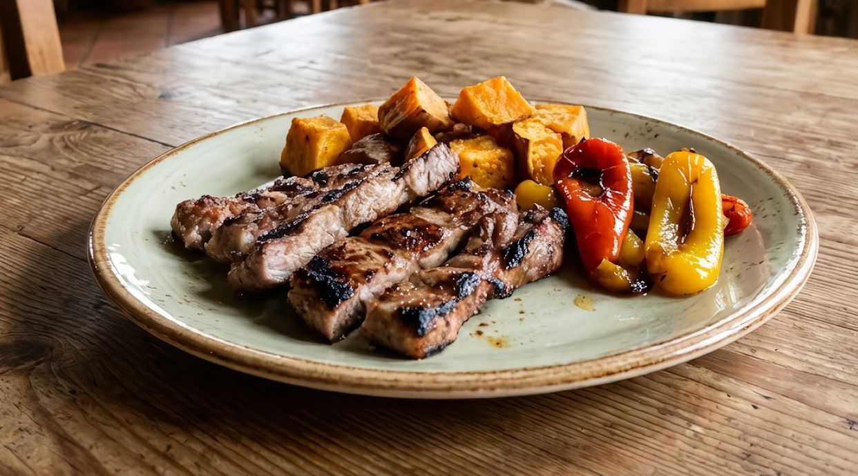 Selección de verduras de la huerta asadas a la parrilla con cebolla, tomate, calabacín, berenjena, espárragos verdes, pimiento verde y pimiento rojo.