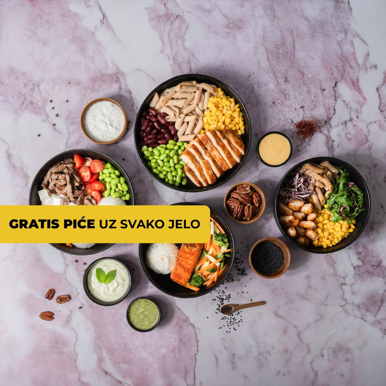 529 kcal + dresing 80 kcal / Marinirani grill pileći file, mix salata, pasta integralna, svježi krastavac, ljubičasti luk, cherry rajčice, feta sir, Tzatziki dresing