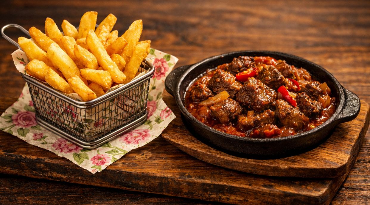 Viazi vilivyokatwa vizuri na kukaangwa hadi kuwa na rangi ya dhahabu na kuwa laini ndani. Hutumikia na mchuzi wa nyama au kachumbari kwa ladha tamu zaidi.