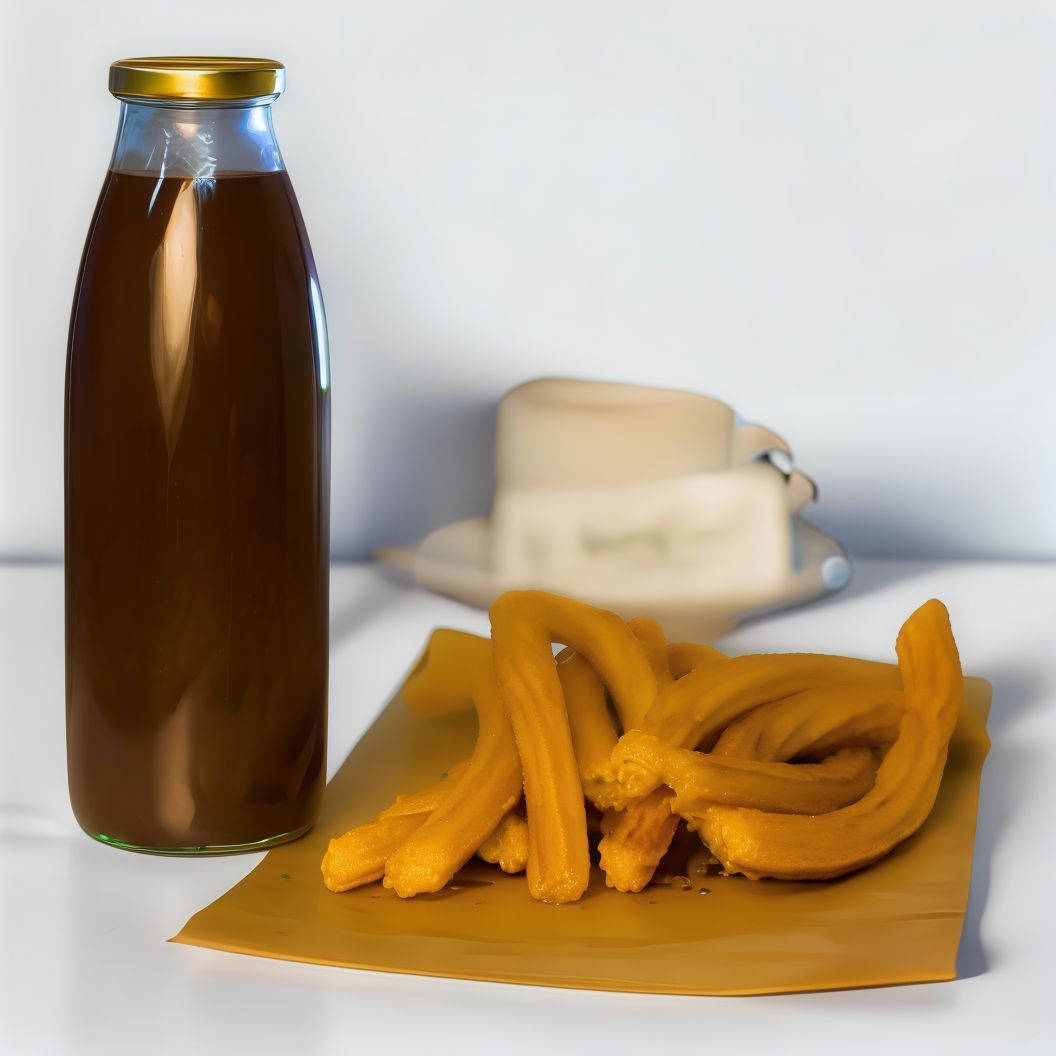 Botella de 500 ml de chocolate caliente con 12 churros. Pack para 2-3 personas.