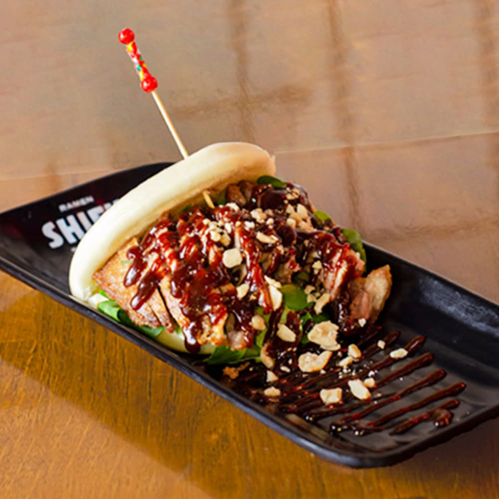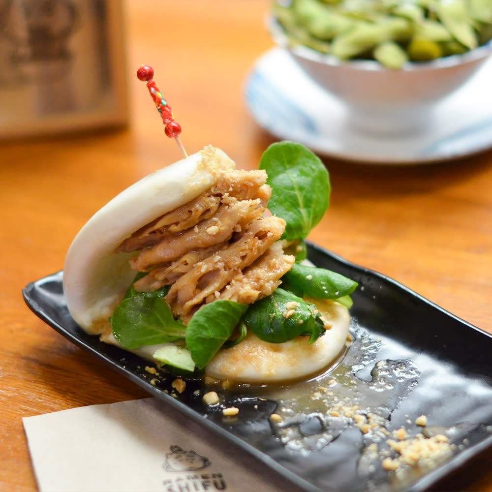 Bao bun a la plancha relleno de pollo frito crujiente, cacahuetes y canónigos, servido con salsa tonkatsu