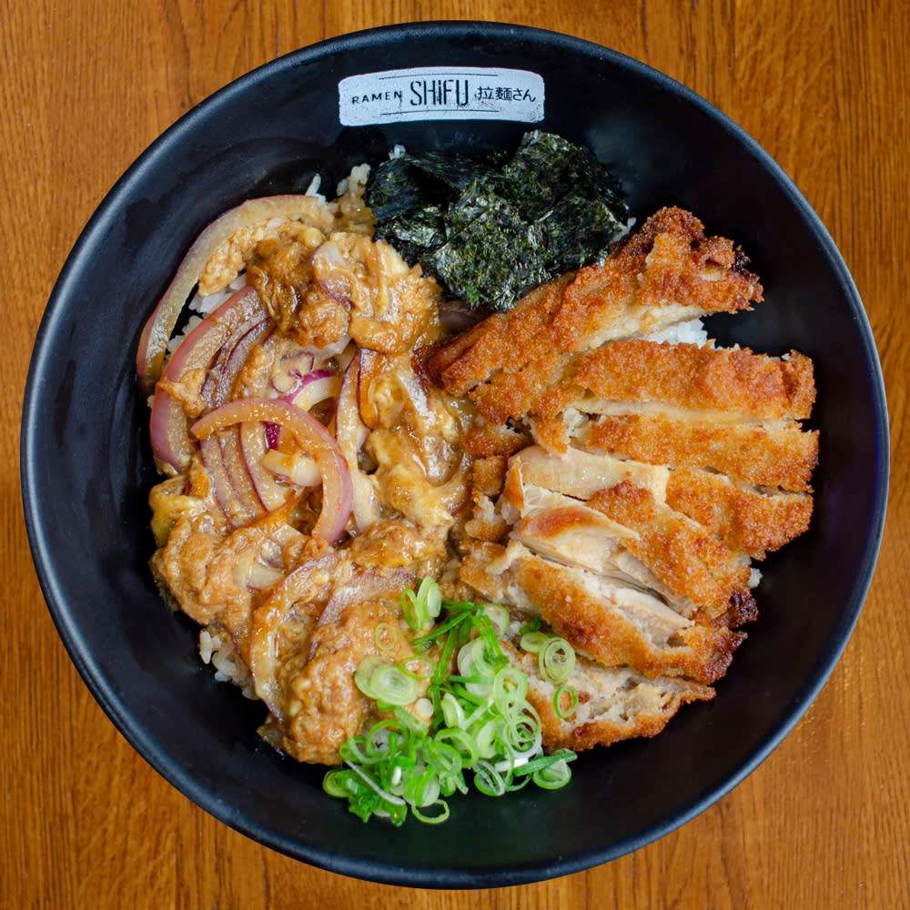 Pollo crujiente con huevo, cebollino, cebolla morada y alga nori servido con arroz blanco.