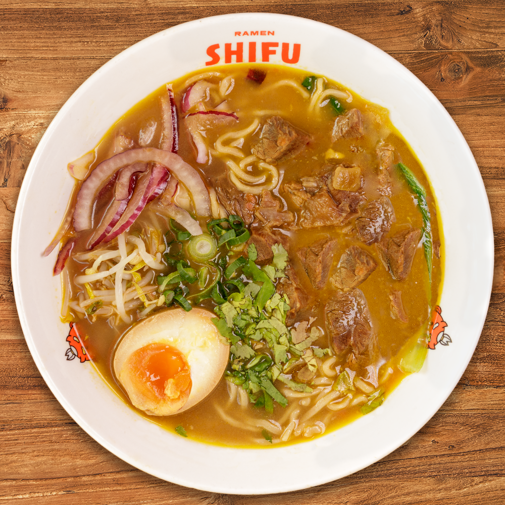 Fideos con ternera guisada, pak choi, brotes de soja, huevo marinado, cebolla morada, cilantro, cebollino, servido con su caldo casero con curry.