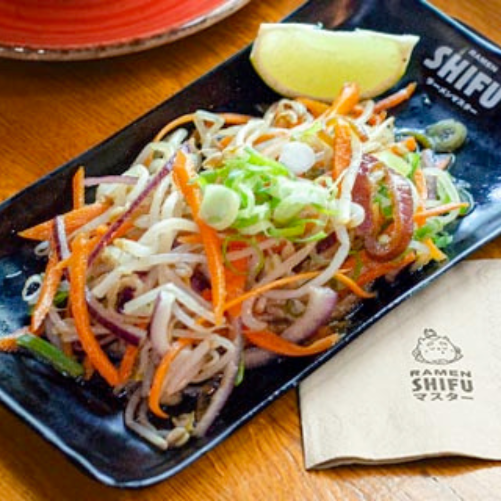 Ensalada de brotes de soja, zanahoria y cebolla morada, con aliño ácido. Servido con lima.