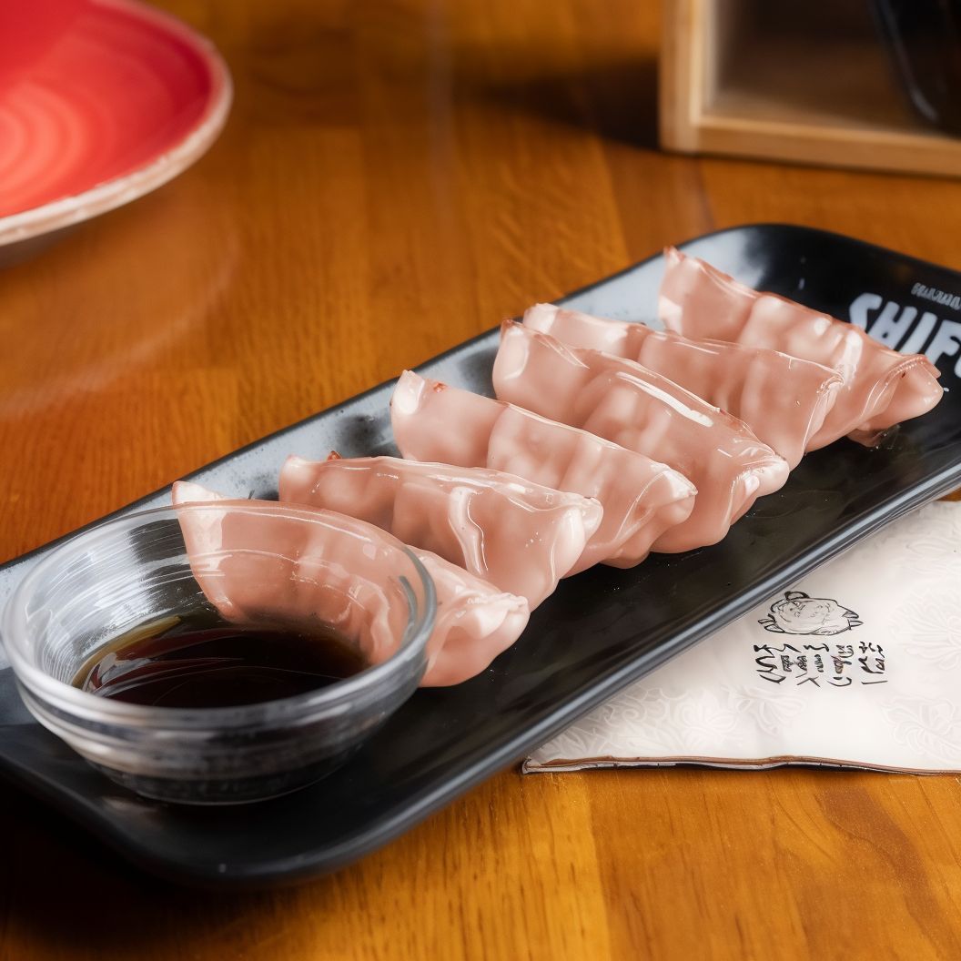 Gyozas a la plancha rellenas de gambas y verduras, servidas con salsa de soja.