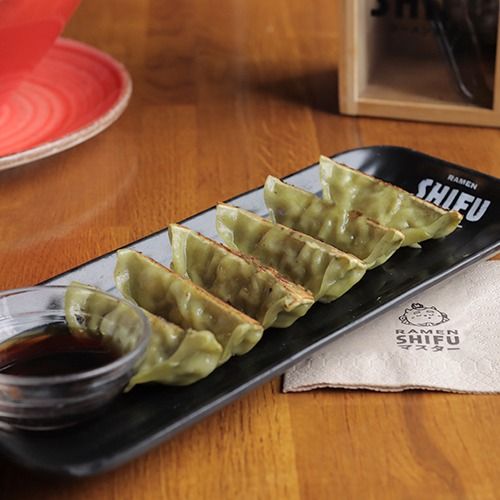 Gyozas a la plancha rellenas de verduras, col, cebollino, ajo y jengibre, servidas con salsa de soja.