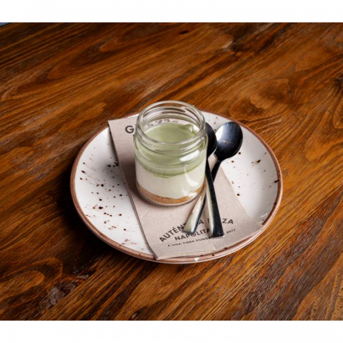 Crema al cioccolato bianco y pistacchio con pistacchio granulado.