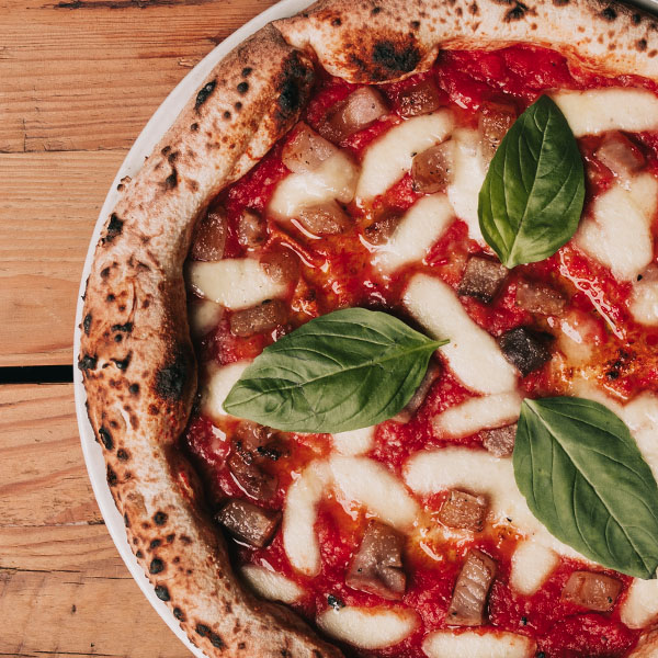 Nuestra versión de la Margherita con provola fresca ahumada, parmesano, un toque de pimienta negra y albahaca.
