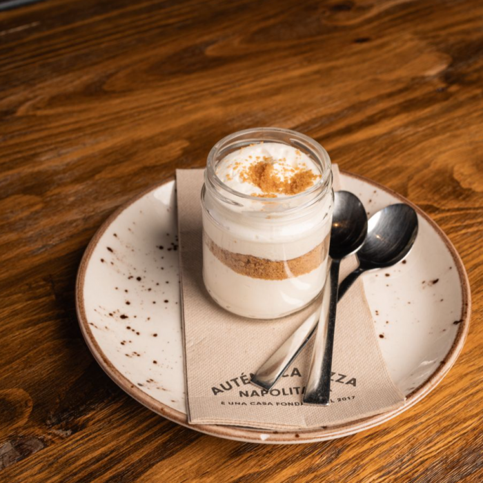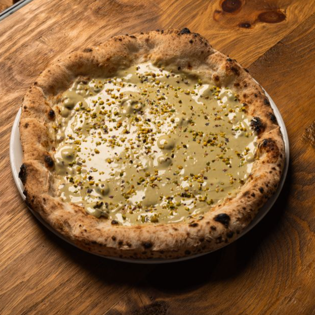 Base bianca de mozzarella fiordilatte, guanciale crujiente, salsa de yema de huevo y un toque de pimienta negra.
