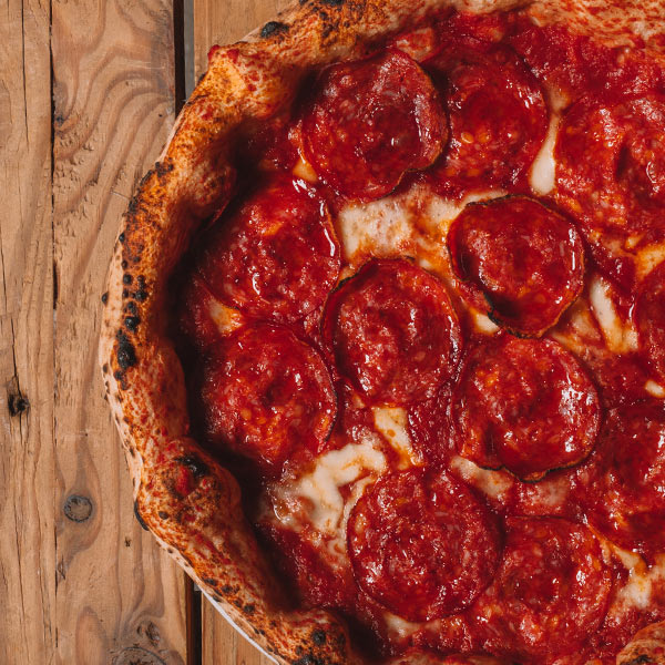 Base de tomate San Marzano, parmesano, mozzarella fiordilatte, salame piccante napolitano con un toque final de hot honey.