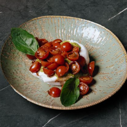Base de tomate San Marzano, variedad de tomate cherry marinado, tomate semiseco, burratina, pesto y albahaca.