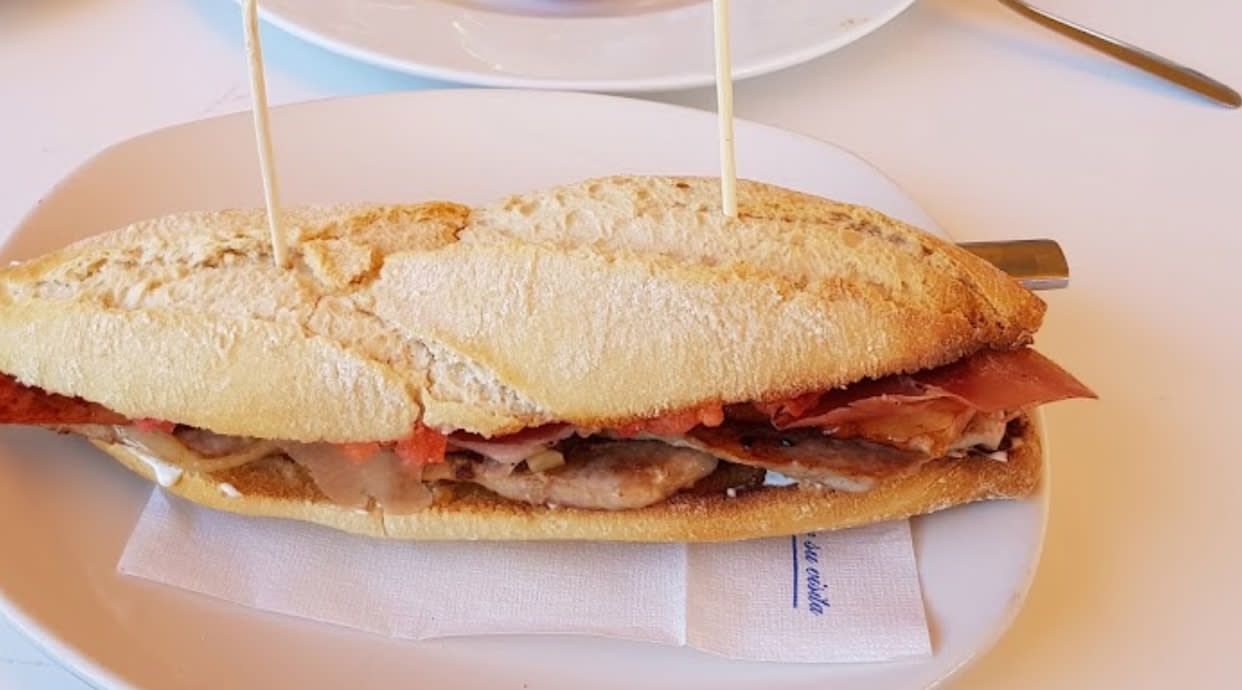 Lomo, serrano plancha, tomate y pimiento verde, con pan mollete