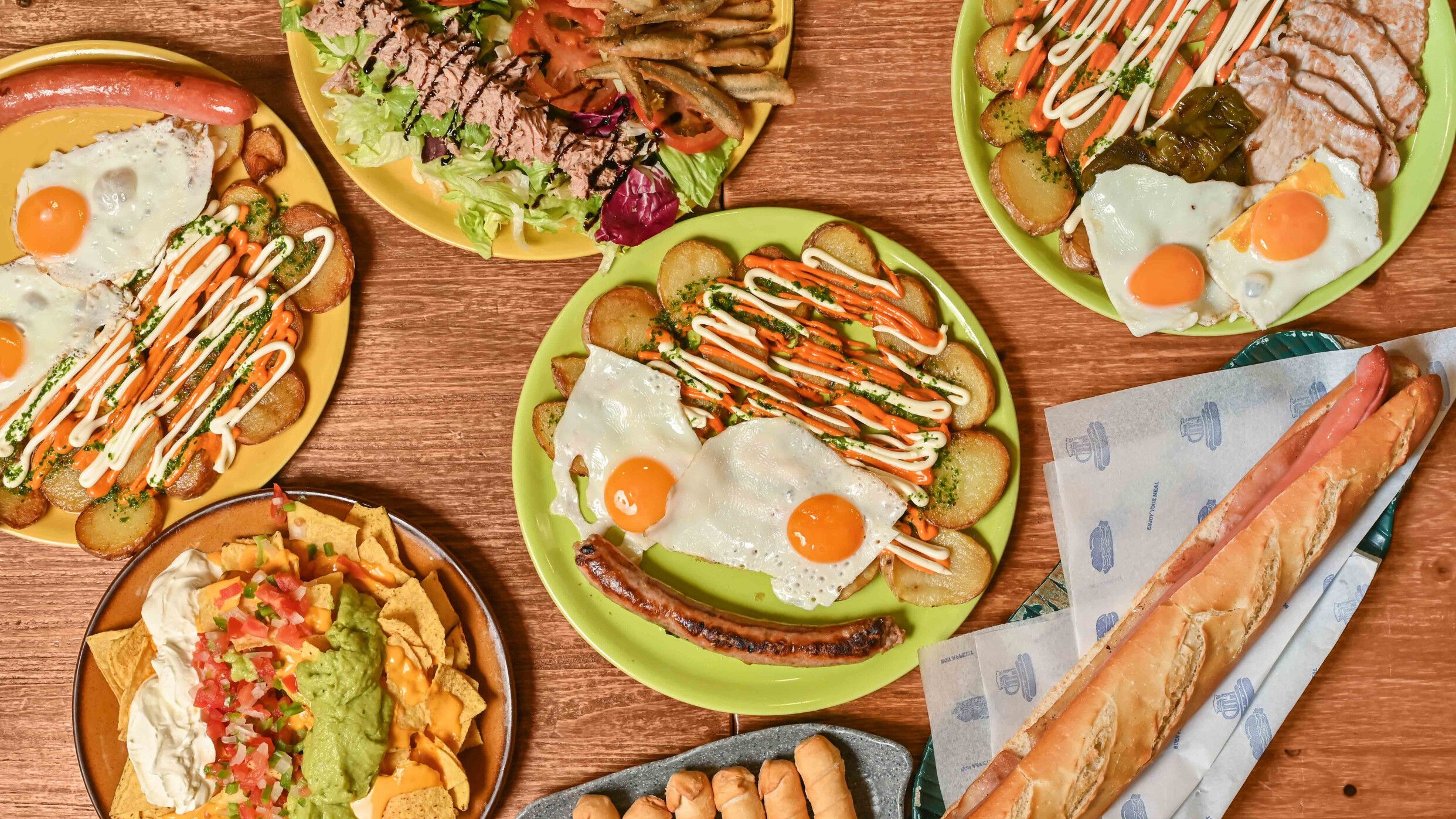 Hamburguesa + bacon + huevo frito + patatas bravas