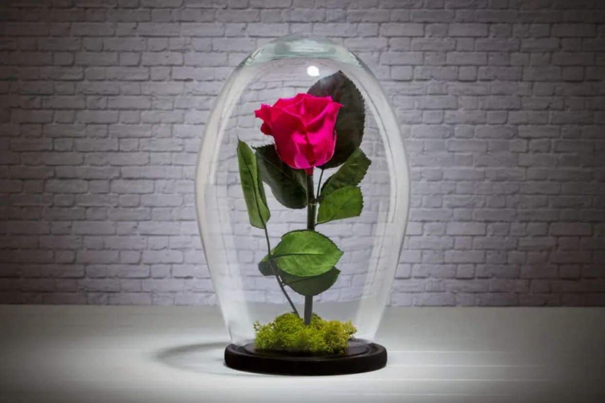 Trandafir criogenat natural în bol de sticlă pe picior metalic
