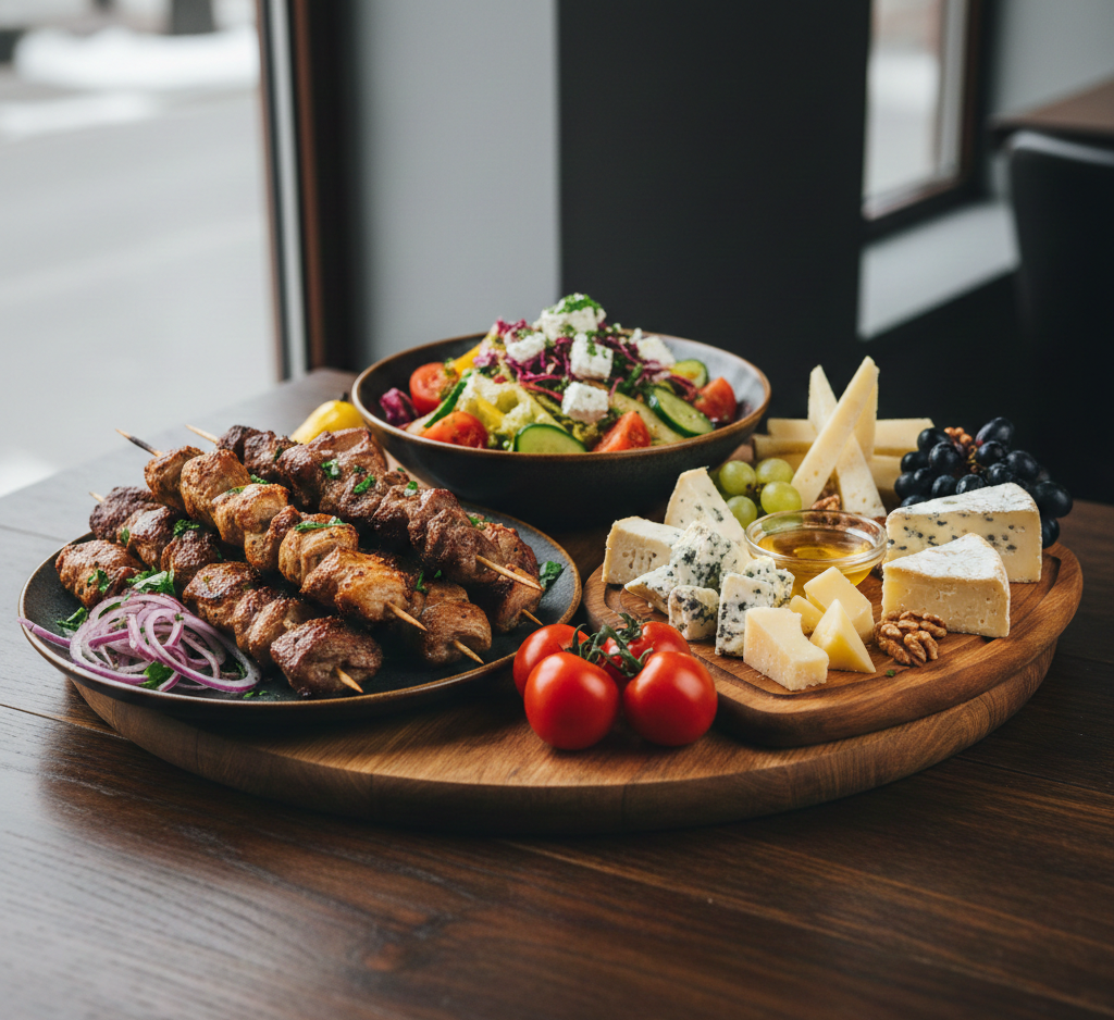 Дор-блю, Пармезан, Брі, солоний та копчений Сулугуні, подається з медом та цукатами