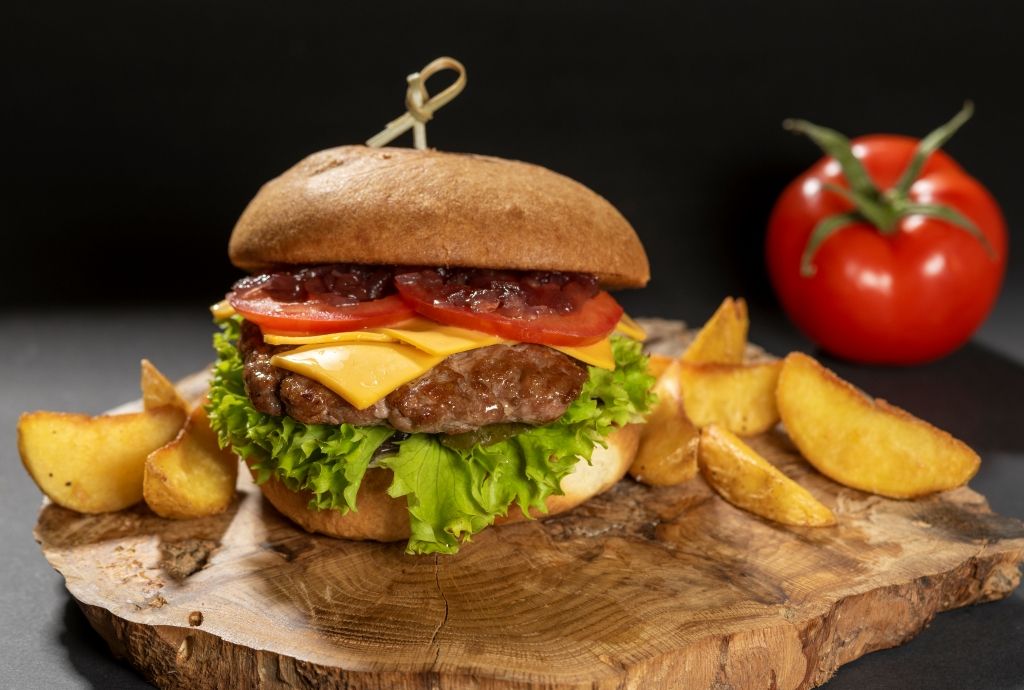 Соковита котлета з телятини, сир Чедер, свіжий айсберг, огірки пікулі та соус власного виробництва. На гарнір можна обрати картоплю : фрі або по-селянськи.
