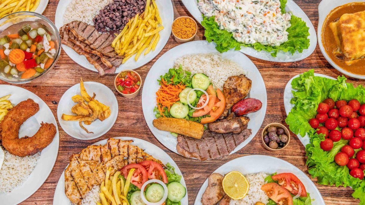 Coxa de frango, salsicha toscana, entrecosto e picanha, acompanhamento e bebida