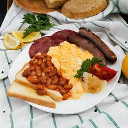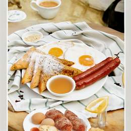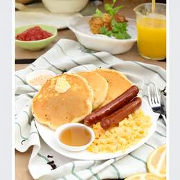 Яичница, тост, на выбор панкейки или вафли и на выбор ветчина или сосиска