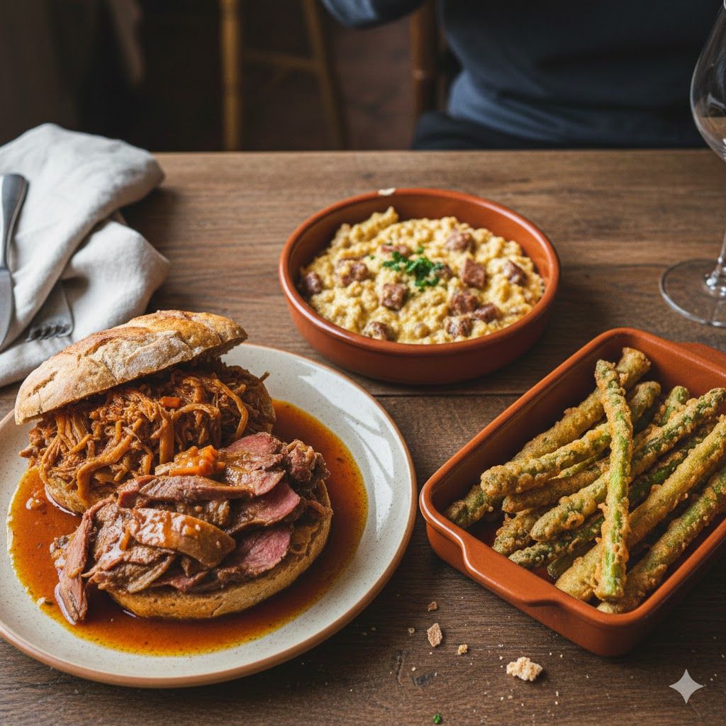 Carnes fervidas durante horas, desfiadas e envolvidas à bruta no seu próprio molho, servidas em pão de lenha.