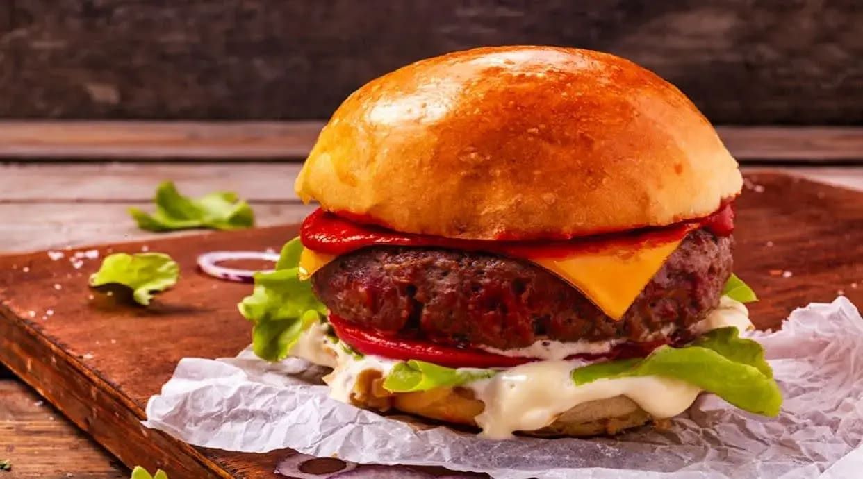 Juneći burger, whisky sos, cheddar sir, salata, kiseli krastavac, crni luk, izbor soseva