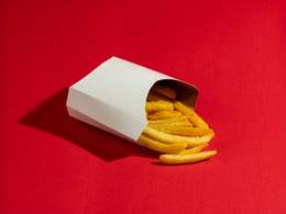 Донер в хрустящем поджаристом батоне с картофелем фри. Сочное говяжье мясо, соленные огурцы, лук и дополняющий своим вкусом белый и красный соус