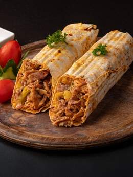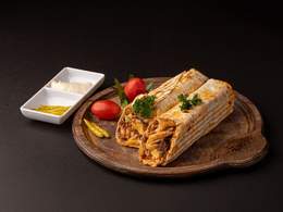 Мягкий лаваш приправленный лазджаном, который придает изысканный и бодрящий вкус блюду. Маринованное куриное мясо, соленные огурцы, лук и ароматный белый соус прекрасно дополняющий своим вкусом