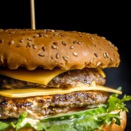 Булочка, котлета, салат, огурцы, помидор, соус, сыр