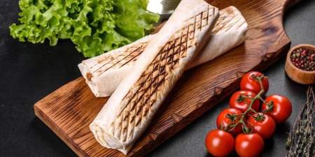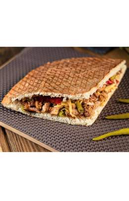 Лепешка,куриное мясо, фри, свежий помидор и огурцы,фирменный соус