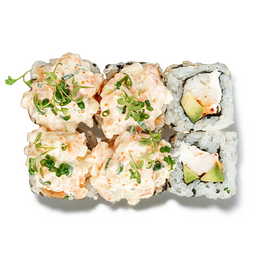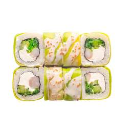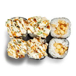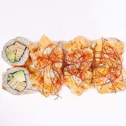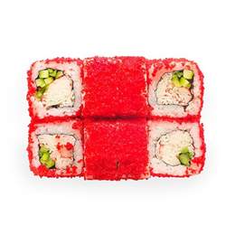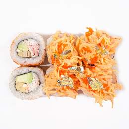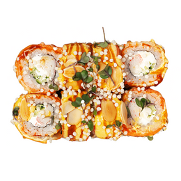 Ролл с крабом и спайси соусом, нежным тамаго и кремовым авокадо внутри. Завершён икрой тобико и листом золота — изысканный вкус в роскошной подаче.