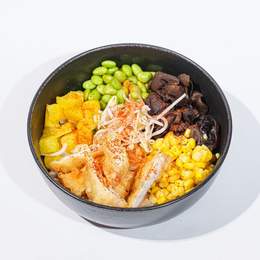 Цыпленок темпура в ореховым соусе, кукуруза, эдамаме, маринованный дайкон, древесные грибы, роски сои на подушке японского риса с соевым соусом