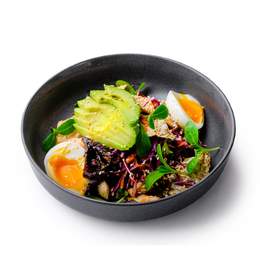 Легкий салат, на основе микса салата, с добавлением куриного филе, спелого авокадо, заправляется медово-горчичным соусом.