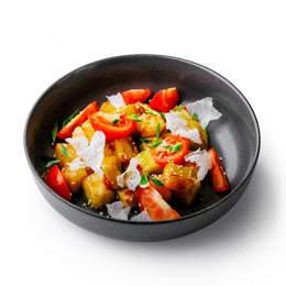 Баклажаны с хрустящей корочкой, подаются со спелыми томатами, в соусе sweet-chill