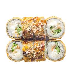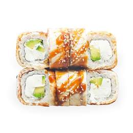 Копченый угорь, сыр Cremette, японский рис, авокадо и салат чука. Подается жаренным в хрустящей корочке